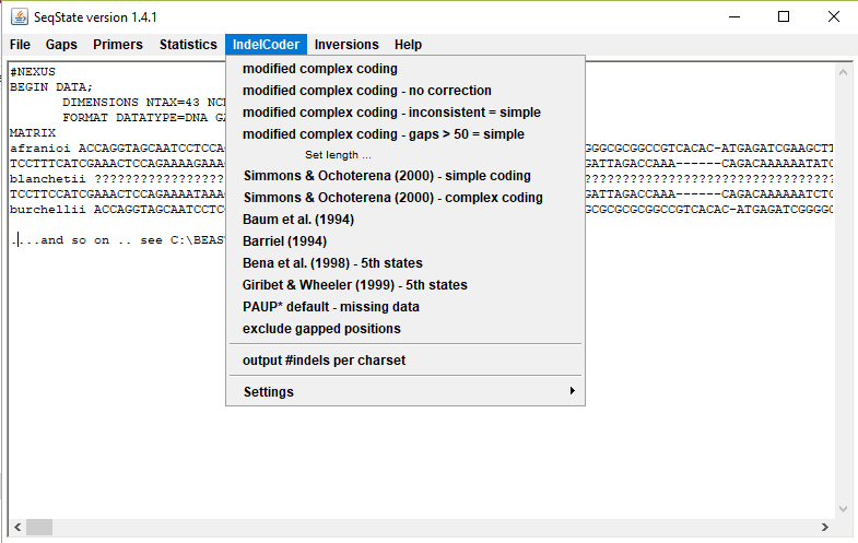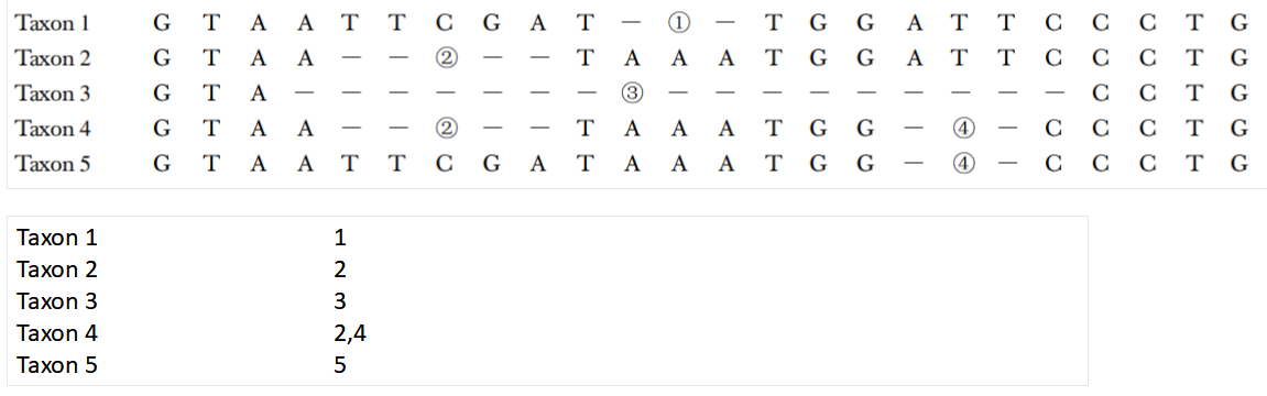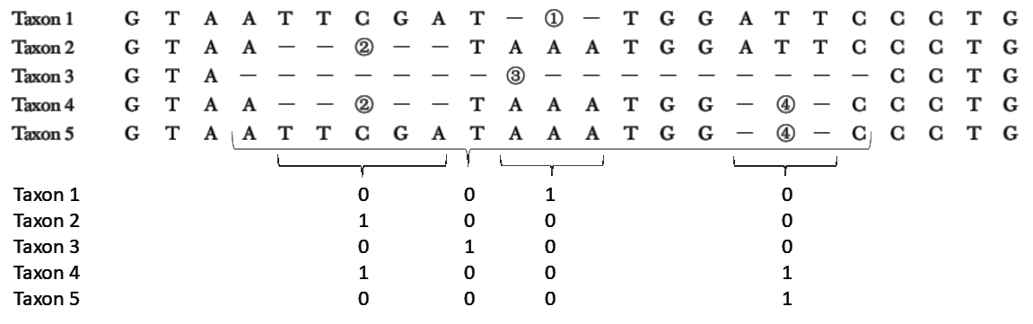 Um fato geralmente observado após um alinhamento múltiplo, são as lacunas na matriz já alinhada. Essas lacunas são denominadas indels, que significa uma junção dos sufixos: inserções e deleções. Esses indels podem ser observados apenas nessa etapa, já que apenas através da comparação entre sequências é que podemos reconhecer uma mutação por inserção e deleções. O padrão de indels também pode ser informativos de parentesco. Existem métodos para codificação de indels (SIC, MCIC, 5th state) que também podem ser adicionados na matriz final. O software SeqState Müller (2005) é um programa open-source, eficiente, com interface simples, desenvolvido em Java, que pode ser utilizado para codificação automática de indels a partir dos três métodos.
