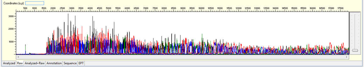- Rastro (trace) do sinal dos nucleotídeos marcados por corante de acordo com a intensidade, indicada por quatro cores correspondentes às quatro bases nitrogenadas.