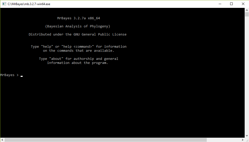 O MrBayes possui um console próprio onde são inseridas as linhas de comando.
