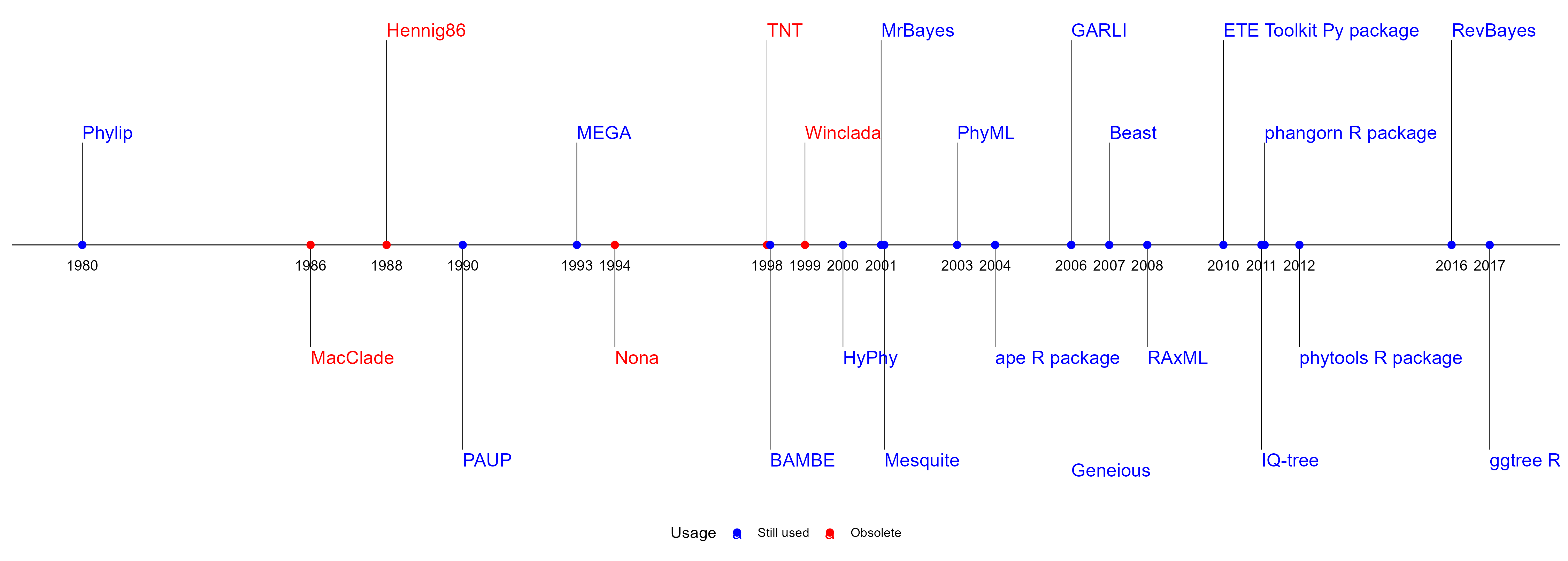 Desde 1980, uma série de softwares vem sendo desenvolvidos para rodar análises filogenéticas.