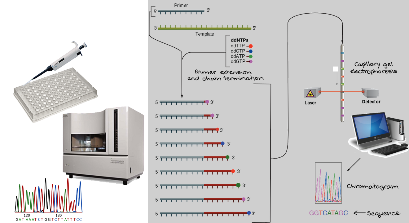 Esse processo aproveita a capacidade da DNA polimerase de incorporar 2’,3’-didesoxinucleotídeos – análogos de bases nucleotídicas que não possuem o grupo 3’-hidroxila essencial na formação da ligação fosfodiéster (DNA Sequencing by Capillary Electrophoresis 3ed).